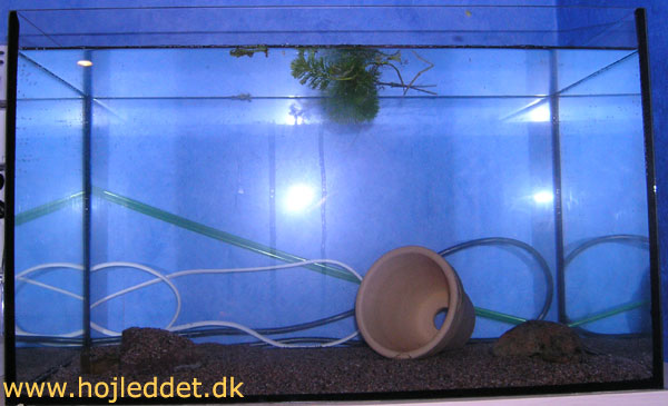 I use an air powered small internal sponge filter for keeping the water clean. It was heated by a 25 W heater and the lighting was done by a home made lamp based on a small 8 W fluorescent tube from Harald Nyborg. I was never content with the lighting solution, mainly due to problems with condensation and an overall clumsy design of the lighting box. It is much easier to handle the lighting box on the 25 liter tanks, where as the box for a 45 liter tank becomes big, bulky and clumsy in my opinion. The light was controlled by the same weekly timer that controlled all the other tanks.